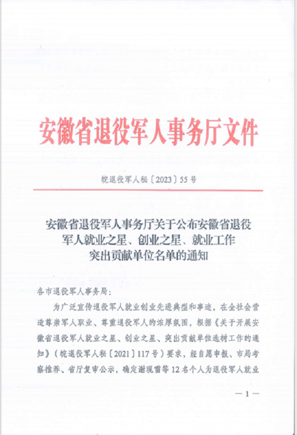 近日,我校因退役军人教育培训工作成绩突出,被安徽省退役军人事务厅授予“安徽省退役军人就业工作突出贡献单位”荣誉称号。